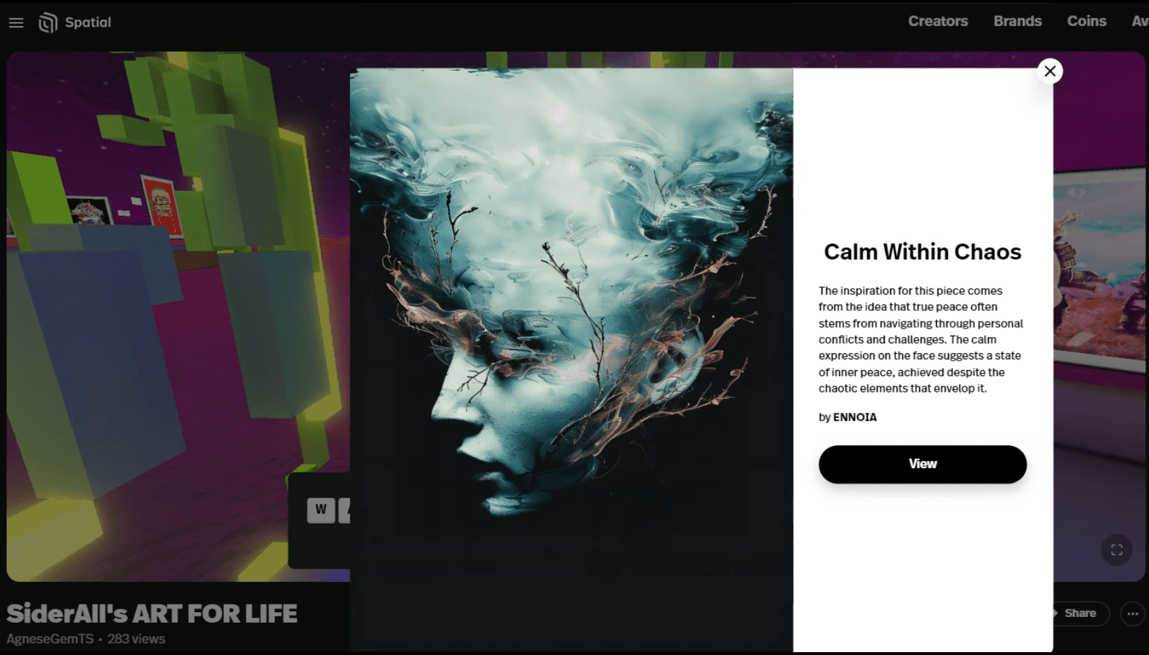 Held in Siderall’s 3D Gallery on the Spatial platform, this virtual event offered visitors an immersive experience, where they could explore artworks through VR headsets at the Helsinki XR Center. Each piece, including Calm Within Chaos, was transformed into an NFT, minted on the TON blockchain, ensuring authenticity and digital ownership. As part of the event’s commitment to social impact, 50% of each NFT sale supported humanitarian efforts in conflict zones.